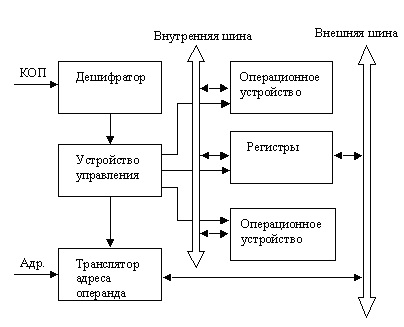 Процессор — это ядро и мотор компьютера, обеспечивает как выполнение операций, так и функционирование всех узлов. Обычно простой процессор включает в себя декодер команд, арифметико-логическое устройство (АЛУ), регистры, транслятор адресов операндов и устройство управления. Отдельные элементы связаны внутренней шиной. Связь с внешними устройствами осуществляется через внешнюю шину.