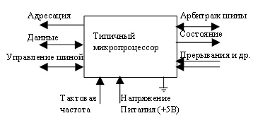 Все перечисленные элементы могут помещаться в одной микросхеме — микропроцессоре. Они доступны через выводы микросхемы при выполнении команд, загружаемых из ОЗУ. На следующем рисунке показаны выводы типичного микропроцессора. Рассмотрим как работает процессор изнутри, на аппаратном и микропрограммном уровне. Далее будет представлено рассмотрение конкретного процессора i8086.