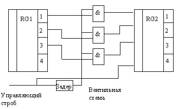 Это логические элементы (коньюнкторы), разрешающие передачу данных (например, на вход триггера). Схема передачи слова данных от источника к приемнику изображена выше на рисунке. Она обеспечивает возможность управлять моментом передачи, подавая в нужный момент сигнал "строб". Слово данных от источника данных (им может быть другой регистр) подается на входы элементов "И". Выходы элементов "И" (вентилей) действуют на входы установки регистра-приемника. Для записи нового кода в регистр-приемник надо последовательно выполнить два действия: