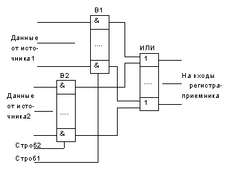 Несколько вентильных линеек В1, В2,...могут быть объединены по выходам линейкой элементов "ИЛИ". Такая структура позволяет передавать слово данных на вход регистра-приемника от одного из нескольких источников при действии разных стробовых сигналов. Такую структуру принято называть мультиплексором (ниже на рисунке).