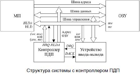 Альтернативой программно-управляемому обмену служит прямой доступ к памяти — способ быстродействующего подключения внешнего устройства, при котором оно обращается к оперативной памяти, не прерывая работы процессора. Такой обмен происходит под управлением отдельного устройства — контроллера прямого доступа к памяти (КПДП). Структура ЭВМ, имеющей в своем составе КПДП, представлена на рисунке (см. рисунок ниже).